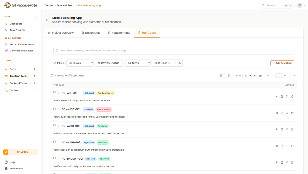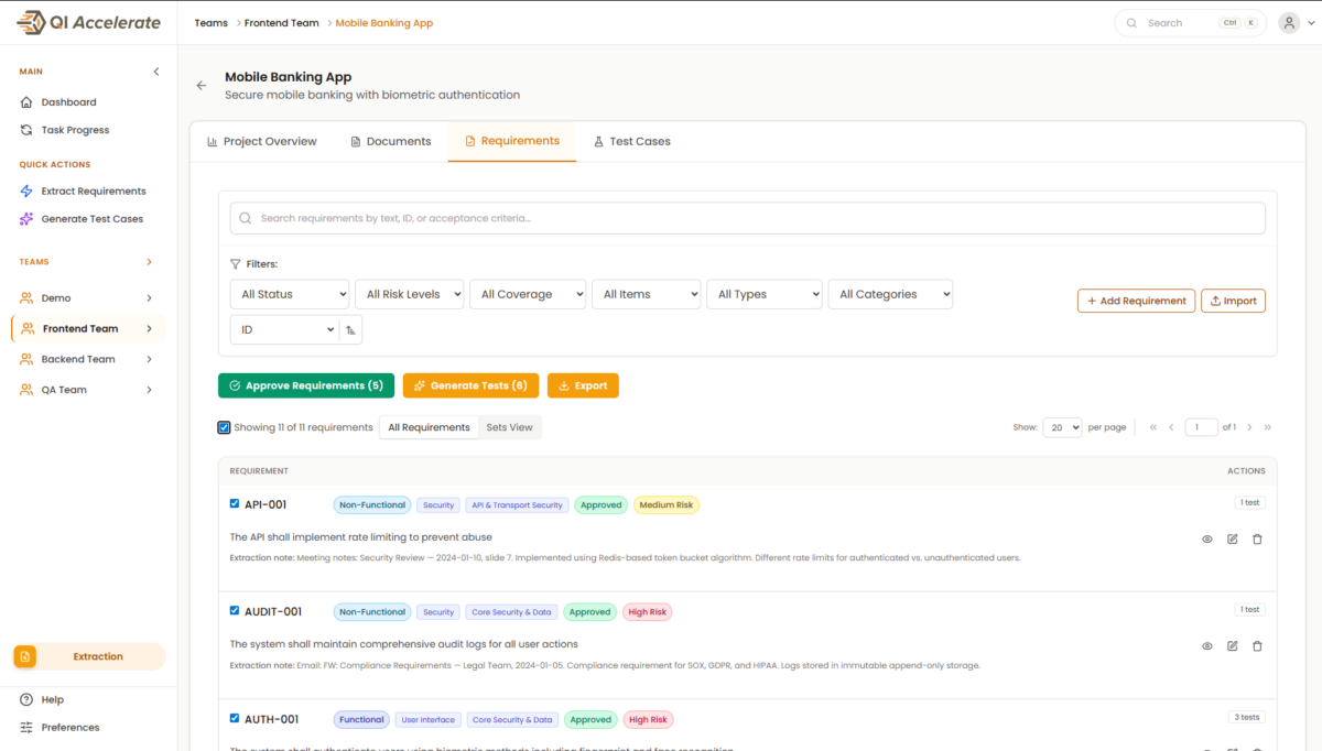 QI Accelerate identificerer og udtrækker krav automatisk og genererer præcise testcases på få minutter – i stedet for dage.